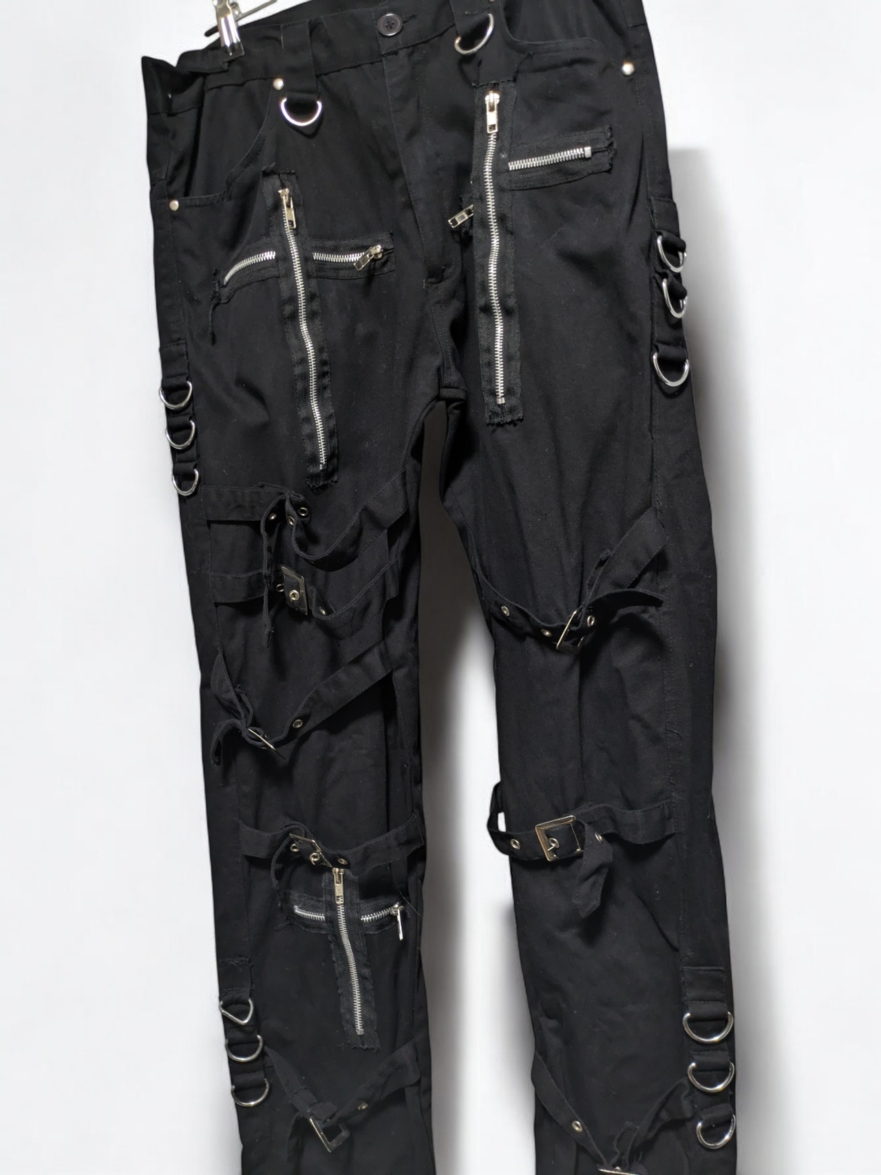 当店得意としているボンテージパンツからズドンとした重厚感を感じられるシルエットにこれでもかと備え付けられているベルトにアクセントとして十字に取り付けられたファスナーという稀有な印象を感じさせるディテールにもなった一本。